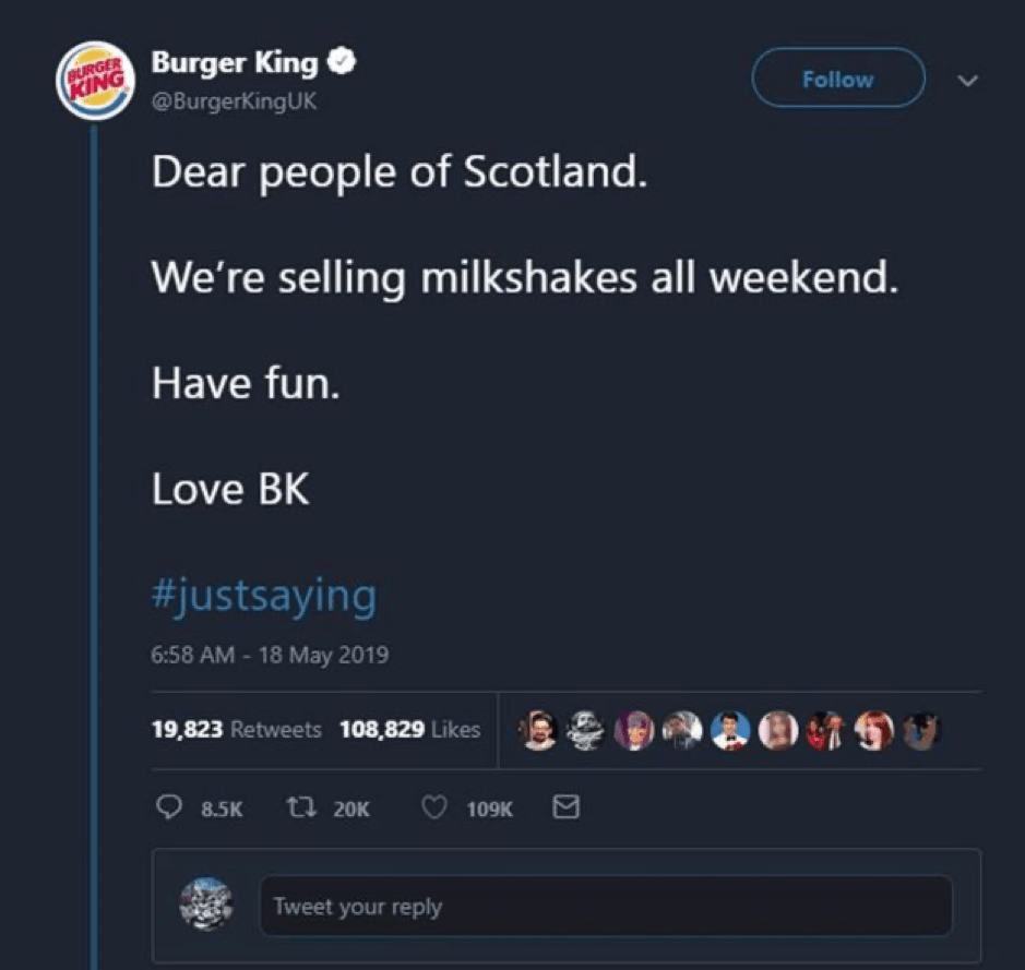 In response to this incident, an Edinburgh-based McDonald’s branch announced in May that it chose not to sell milkshakes while a Brexit political rally, addressed by Farage, was held nearby. However, Burger King’s approach was different. Shortly after the McDonald’s announcement, they tweeted: